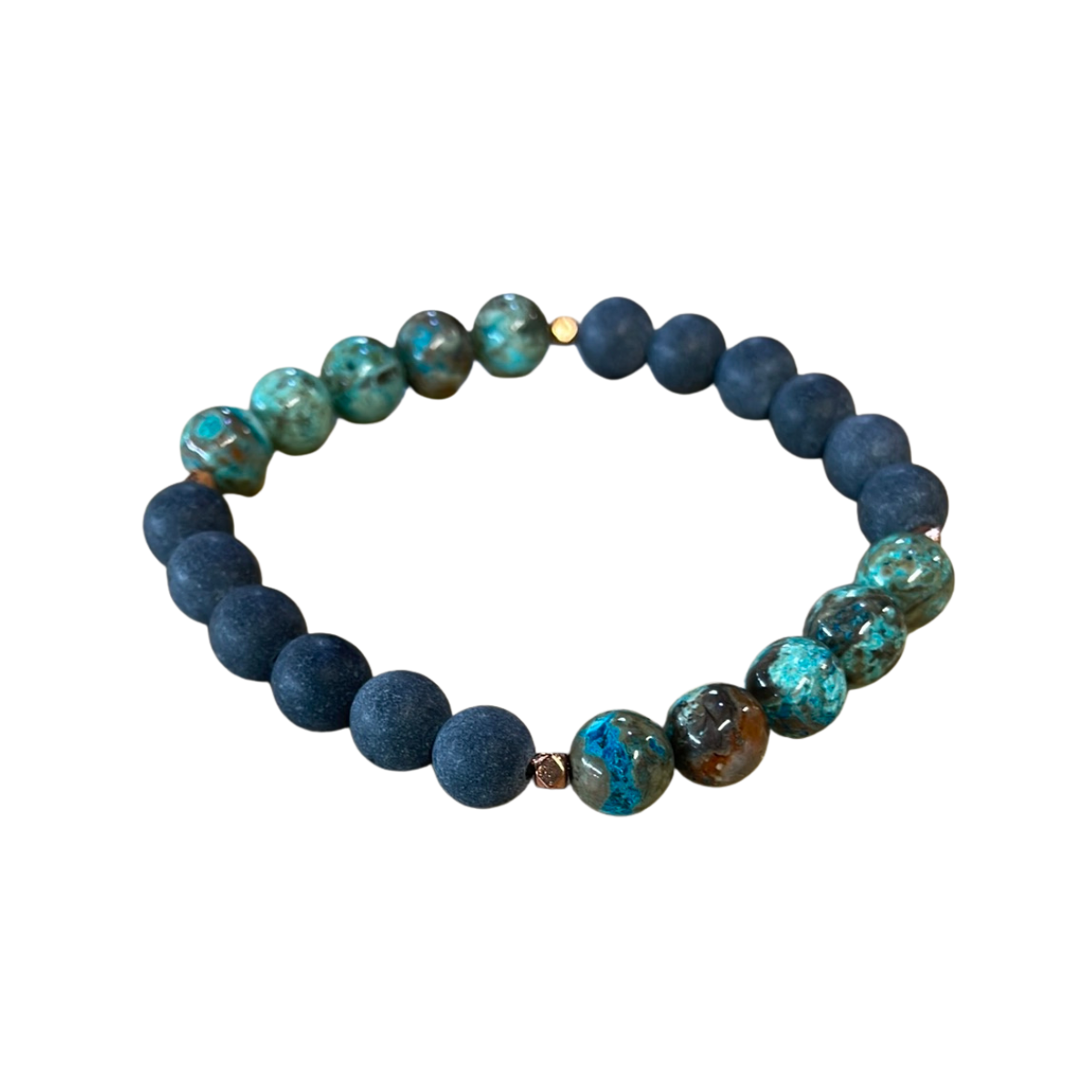 The Origin bracelet features needle stone beads, solid brass accent spacers, and Turquoise beads.